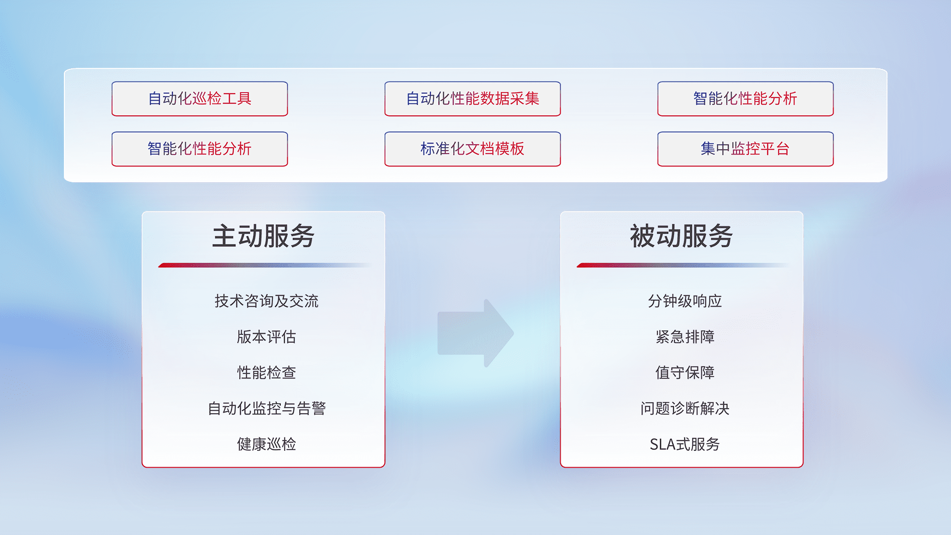 智能化工具和标准化文档,,,保障服务质量,,,提供主动服务(包含技术咨询、、、、版本评估、、性能检查、、、自动化监控与告警、、健康巡检)和被动服务包含(分钟级响应、、、、紧急排障、、、、值守保障、、、、问题诊断解决、、SLA服务)。。。。